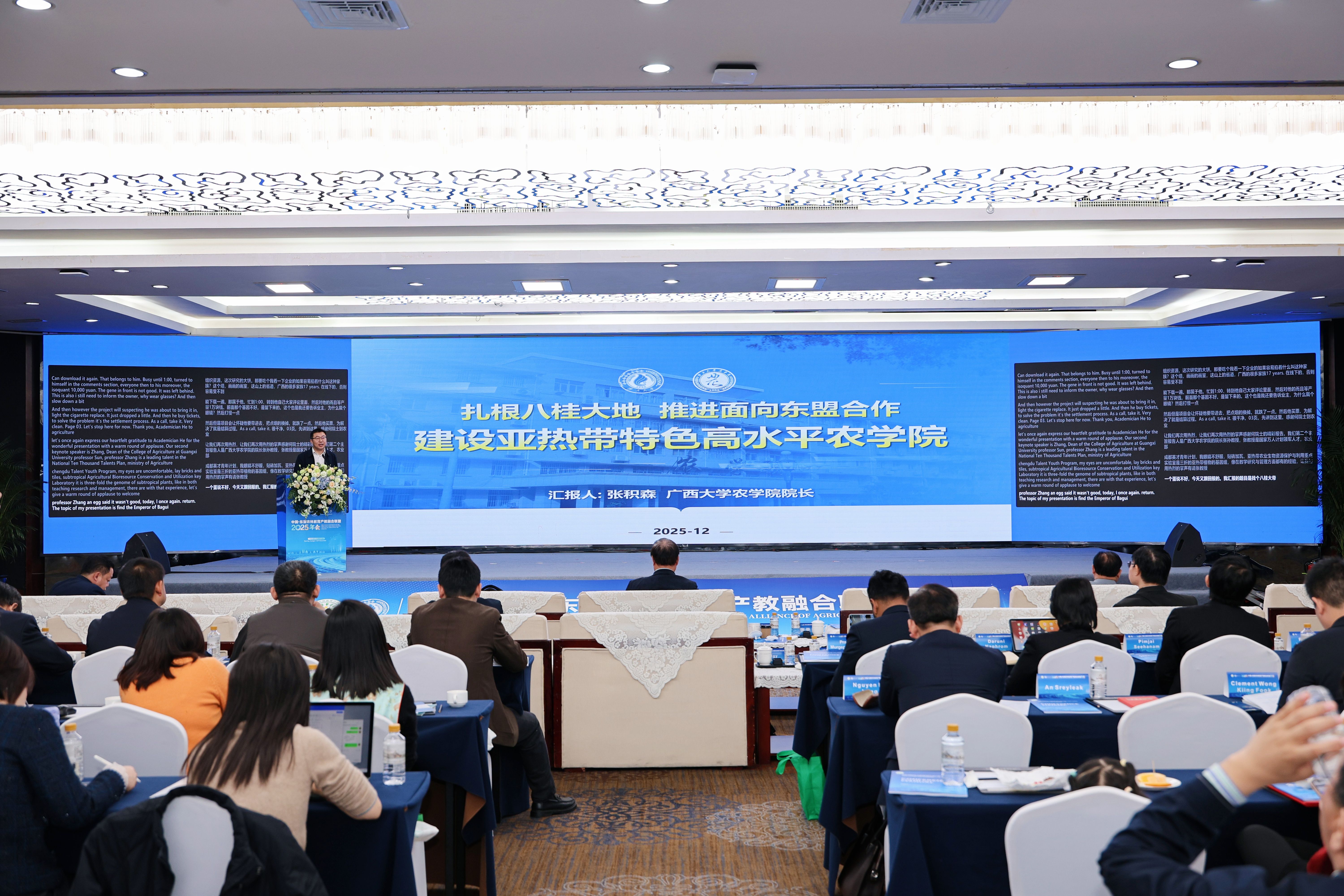 12 月 19 日,由yl23411永利集团牵头主办的 “中国 — 东盟农林教育产教融合联盟2025年会” 在南宁顺利举行。来自中国及东盟国家涉农高校、科研机构、行业企业的 200 余名代表齐聚一堂,围绕 “智慧农业与绿色转型” 主题,就数字赋能、绿色增效、农林业高质量发展与区域协同等核心议题深入研讨,共同探索农林教育与科产教融合发展的新思路、新举措、新路径。