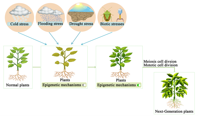 表观遗传机制传递示意图:当植物遭受生物及非生物胁迫时,表观遗传机制被激活,导致跨代遗传,增强其对多变环境的适应性